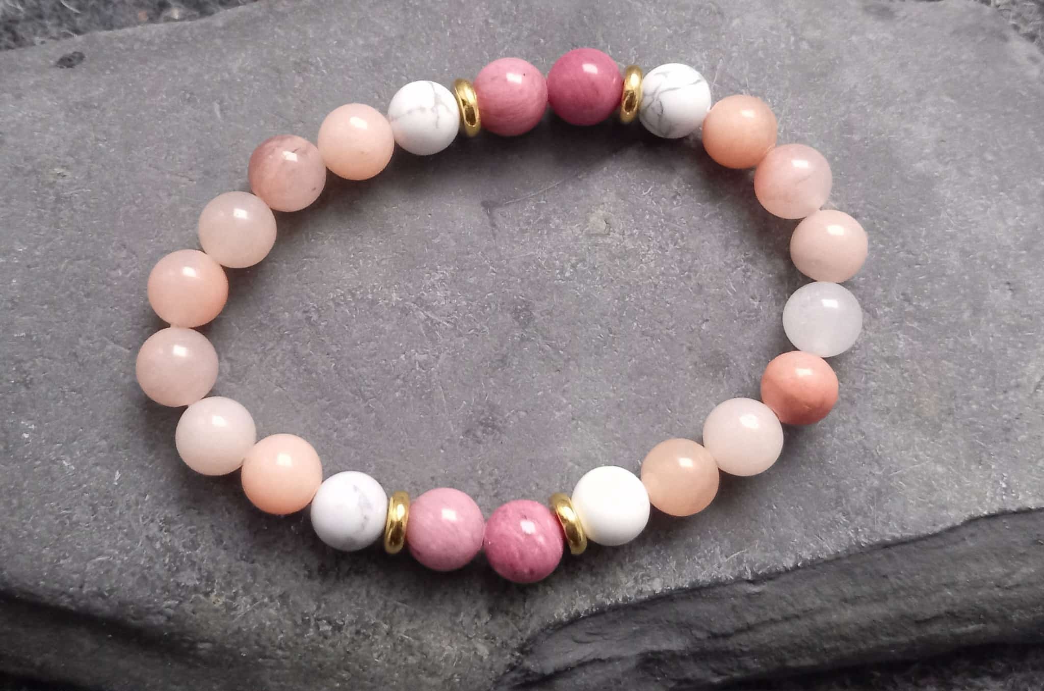 Kristallarmband med rodonit, persikoaventurin och howlit.