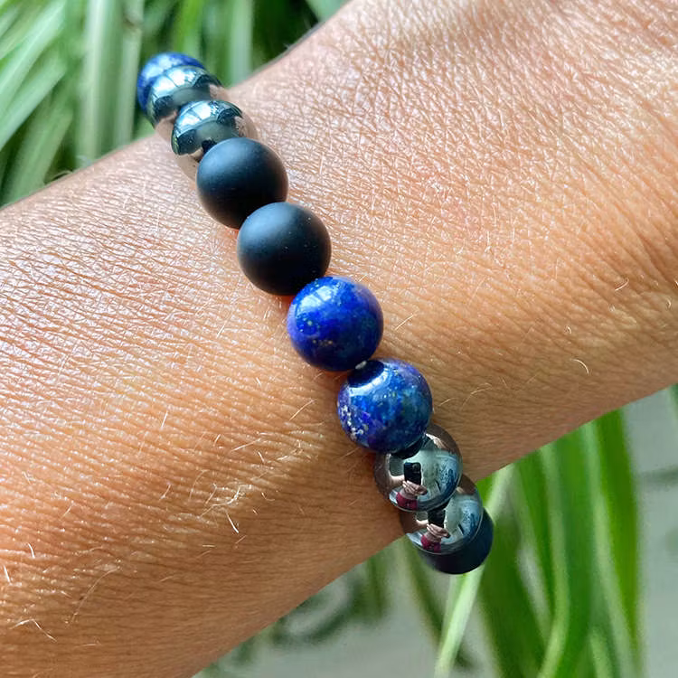 Kristallarmband med svart onyx, hematit och lapis lazuli. Jordar dig, stärker energifältet och skyddar mot oönskade energier.