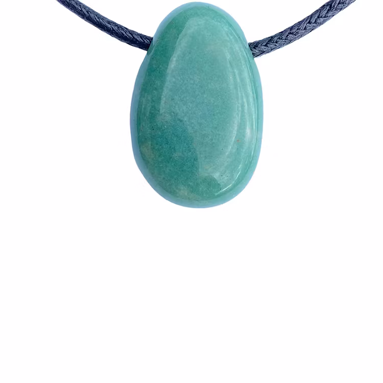 Hänge av grön aventurin, ca 3,5 cm. Svart läderrem ingår.